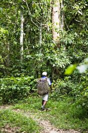 växer vilt i regnskogen och skördas av